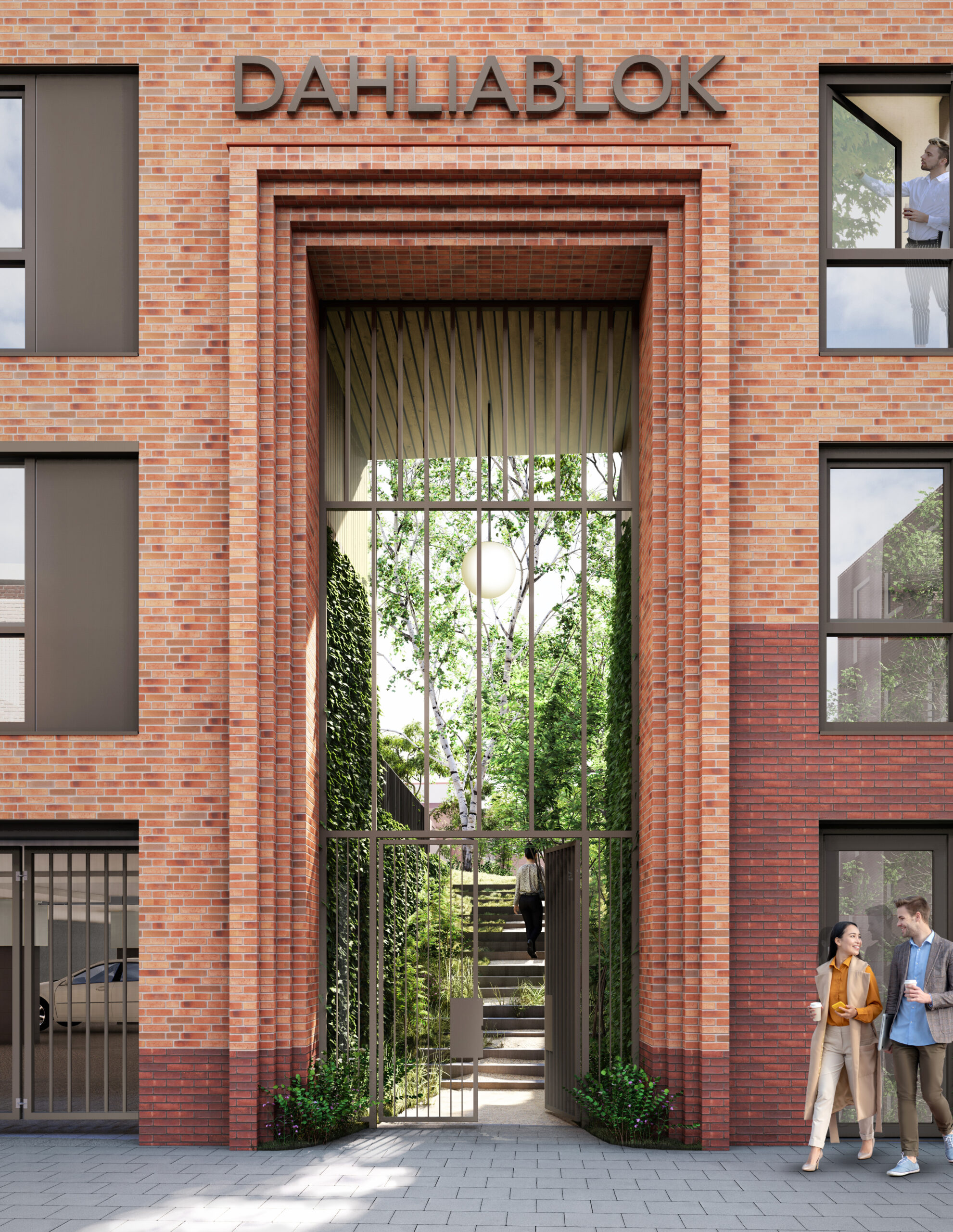 In de wijk Bloemhof op Rotterdam-Zuid wordt het Dahliablok herontwikkeld als een maximaal groen woongebied. De mix van eensgezinswoningen, boven,- benedenwoningen en appartementen is georganiseerd rond een glooiende binnentuin, waaronder gedeeltelijk geparkeerd wordt. Door een grote poort is deze weelderige binnentuin beleefbaar vanuit de straat.