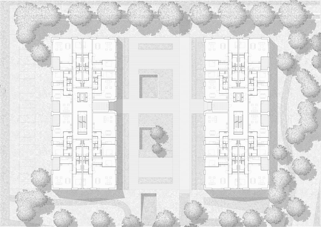 Between these two apartment buildings lies an inner garden atop a parking garage, which, due to its slightly elevated position, has a certain seclusion. This green garden is the connection between the main entrances of the residential buildings, the existing environment, and the transformed part of the former boarding school.