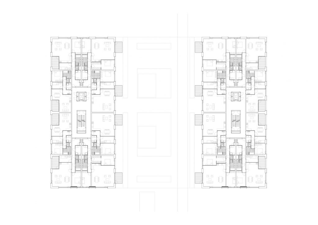 The new construction presents a dual character. Viewed from the park, the buildings exhibit a formal demeanor. The layout is symmetrical, the ground floor is situated over one meter above ground level, and the facades are distinguished by a rigid grid of large window openings and loggias. The addition of large, staggered balconies and outdoor spaces at the deck level lends an informal character to the side facing the inner garden. The communal garden incorporates various seating areas, creating a vibrant meeting and dwelling space.