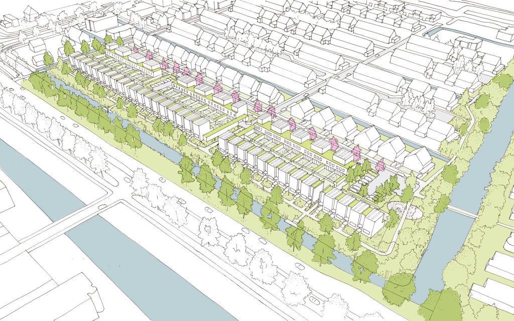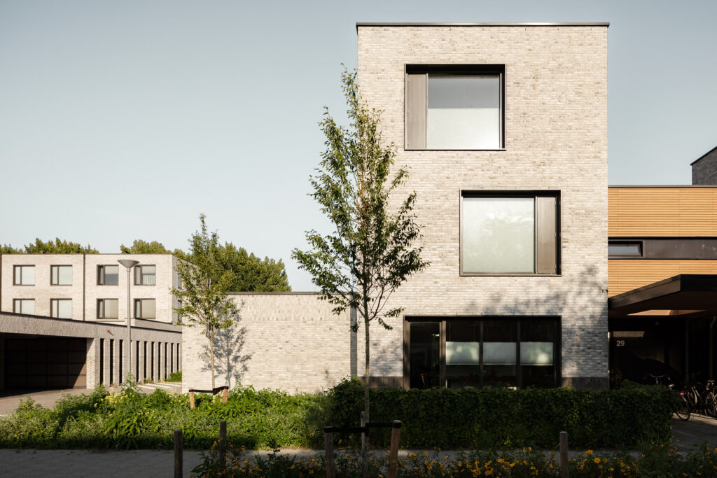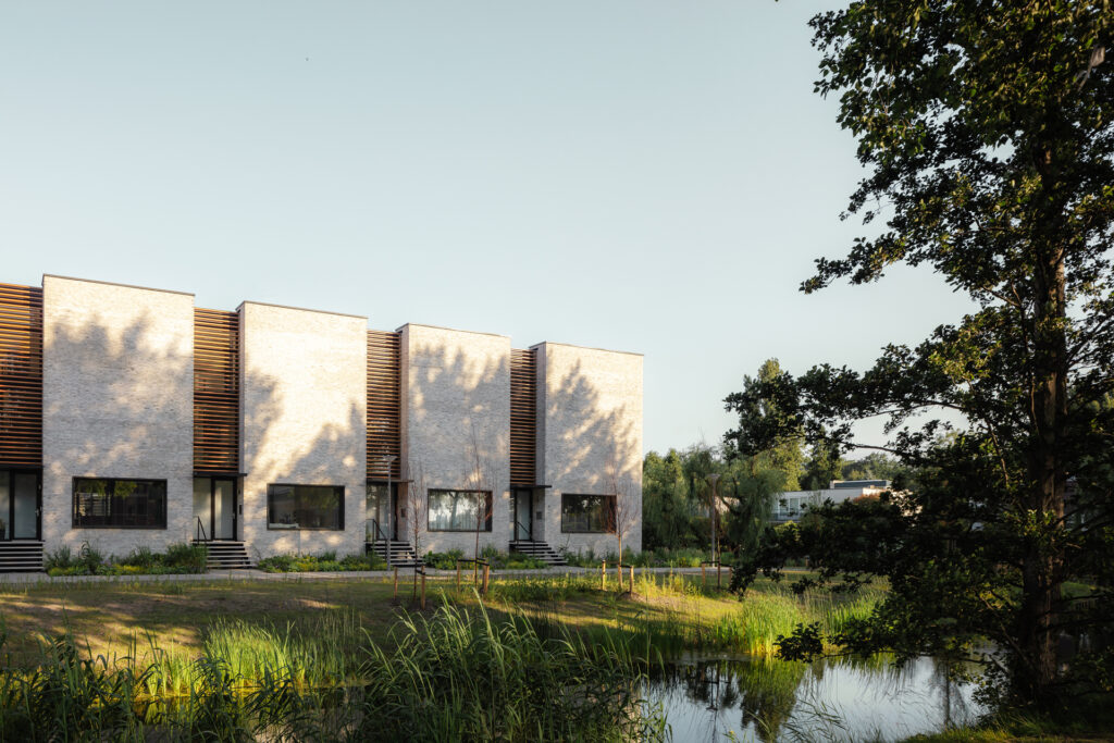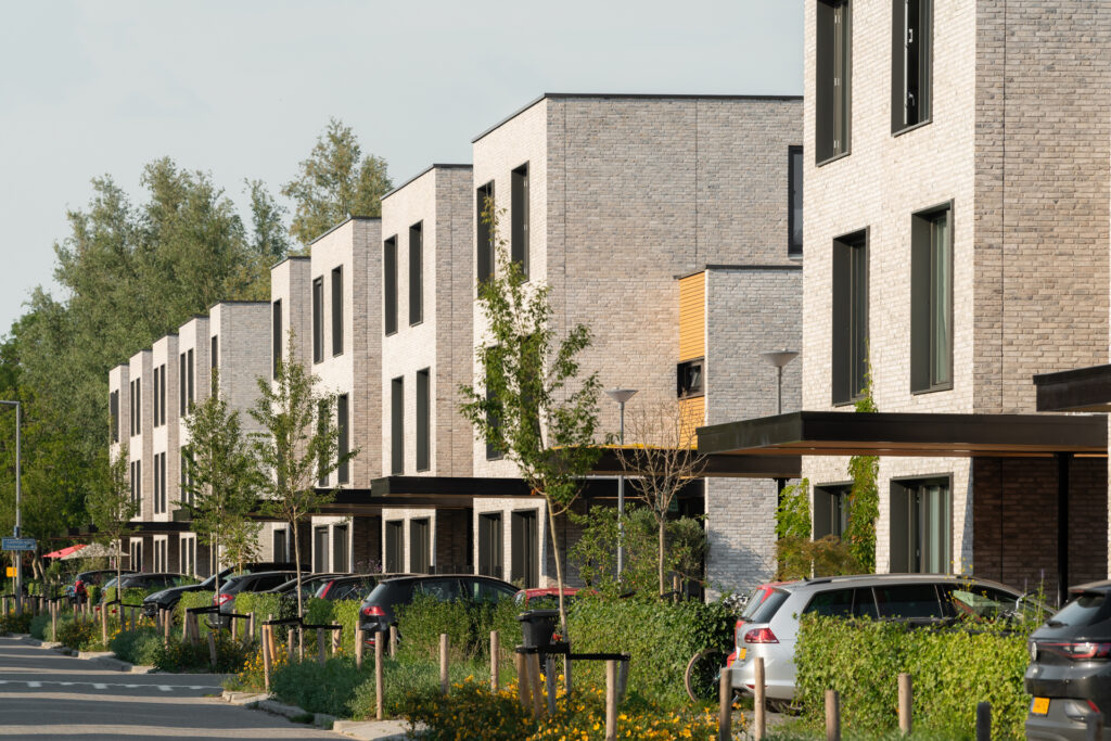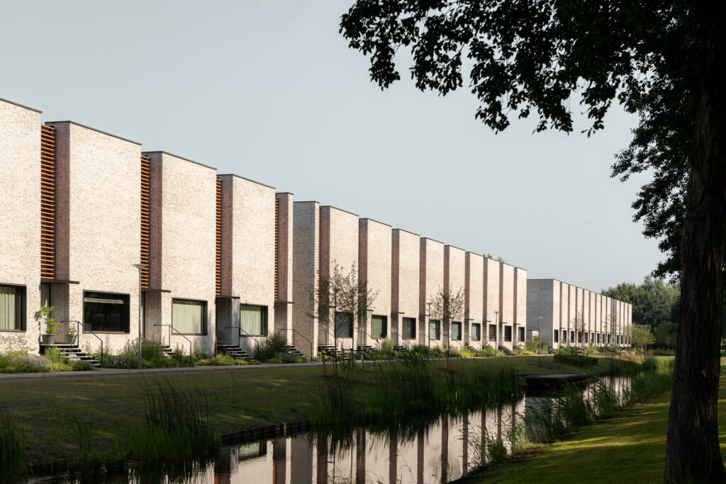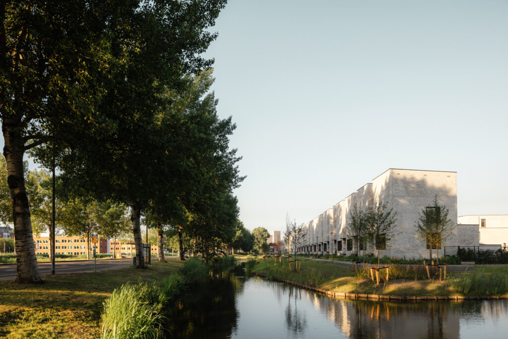 The houses are connected to the heating network, all have green roofs and solar panels. By incorporating a lush green strip alongside the water, not only the habitat for local flora and fauna is expanded but also nesting opportunities for swifts are introduced in the end facades.