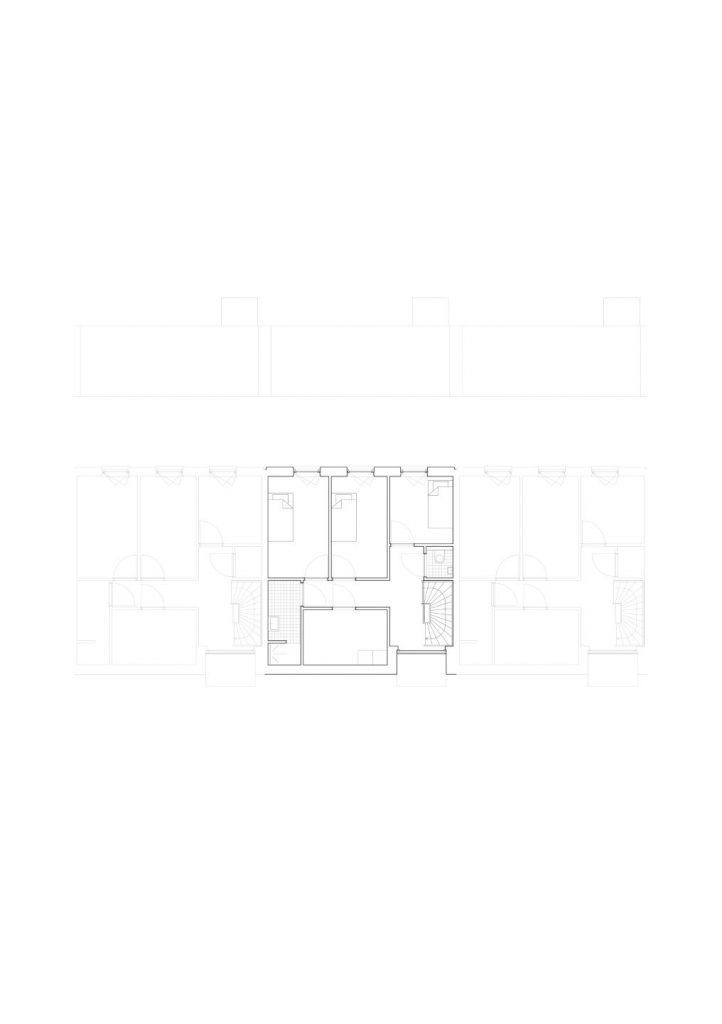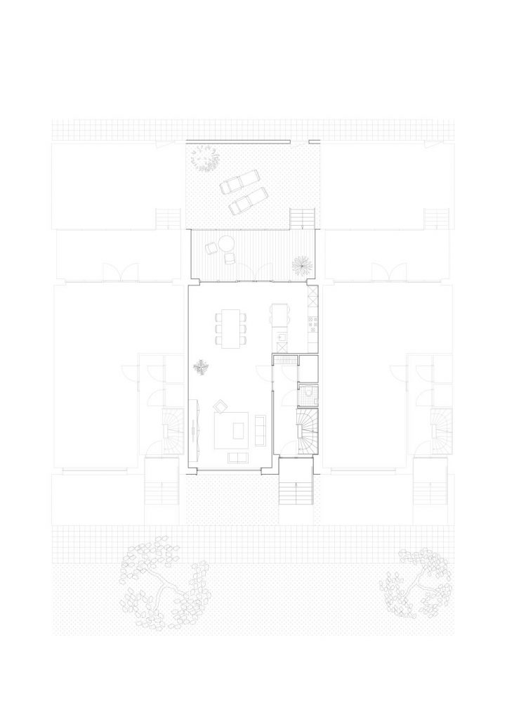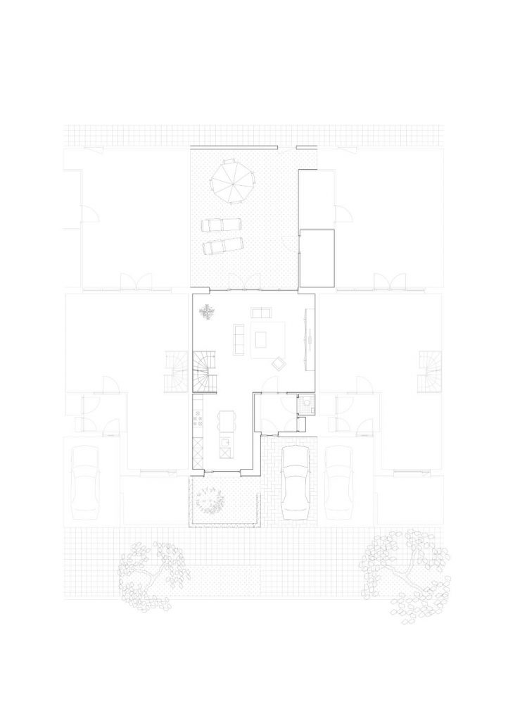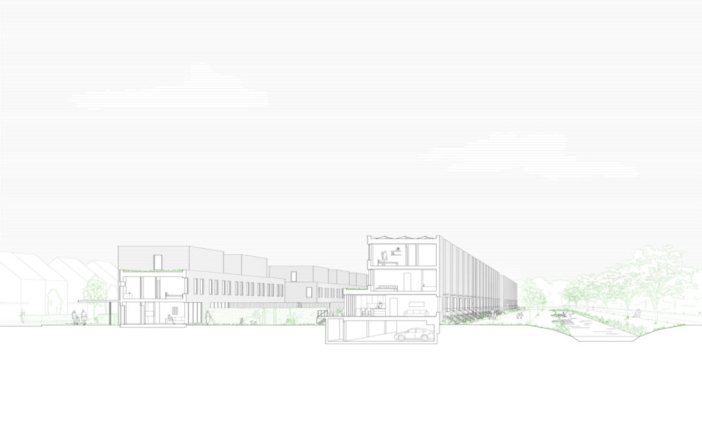 The chosen parking solution has been a leading factor for the urban design and clearly demonstrates the two-sided characteristic of the site. For the 31 terraced houses on the east side, parking is placed in a semi-sunken basement underneath the houses. This creates space for a green zone on the traffic-free front side. On the neighbourhood side, 23 semi-detached houses with carports are situated in connection with the typology across the street which is common in the area. The visitor parking is positioned in the green parking lots between the houses.