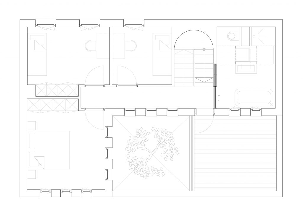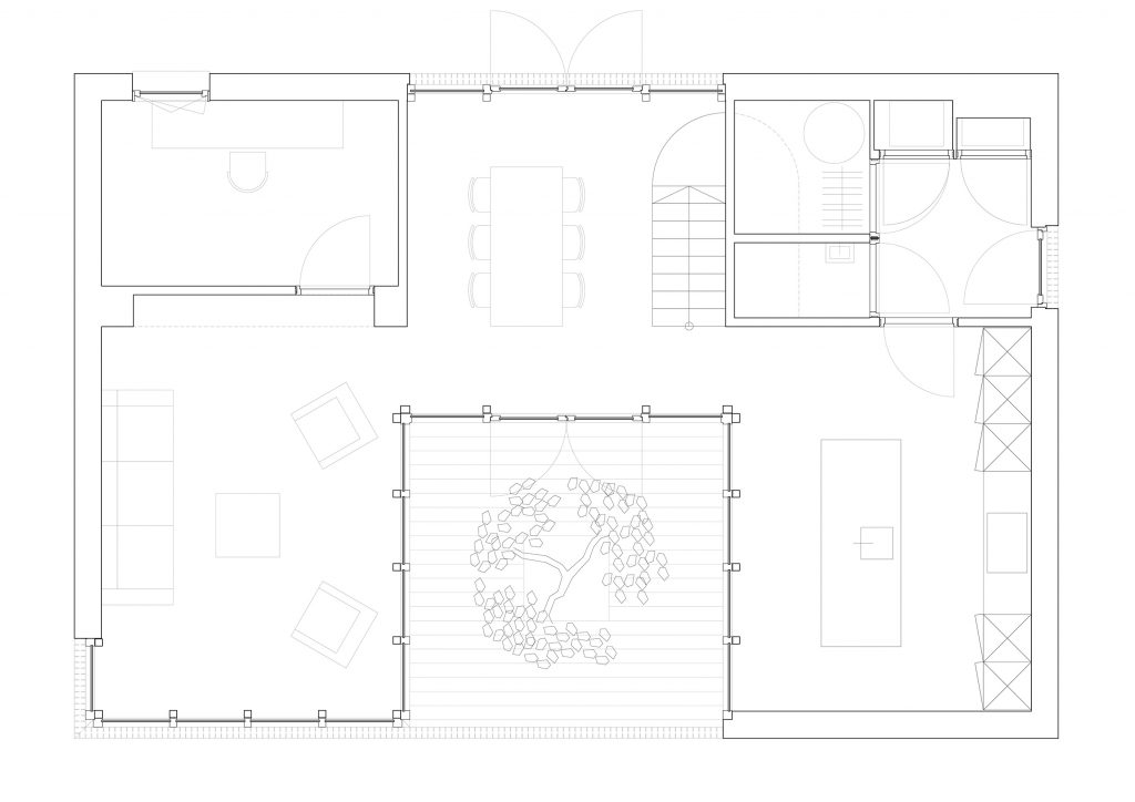 Om op het juiste moment zonlicht in het hart van het huis binnen te halen is op de verdieping één kamer een buitenkamer. Hier komt de dakvorm samen in het laagste punt om de bezonning van de patio te optimaliseren. Dit zorgt voor de specifieke hoofdvorm van de woning en resulteert in een dubbel gekromd groendak dat aan de binnenzijde is opgebouwd uit verschrankte houten plafondbalken.