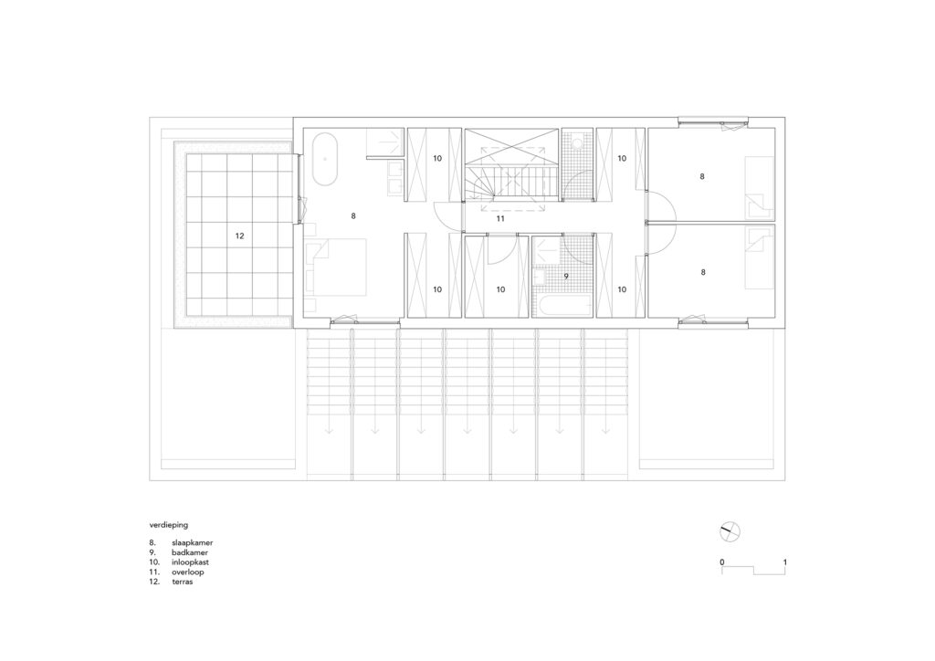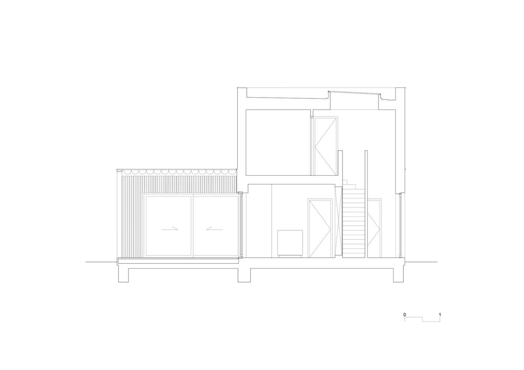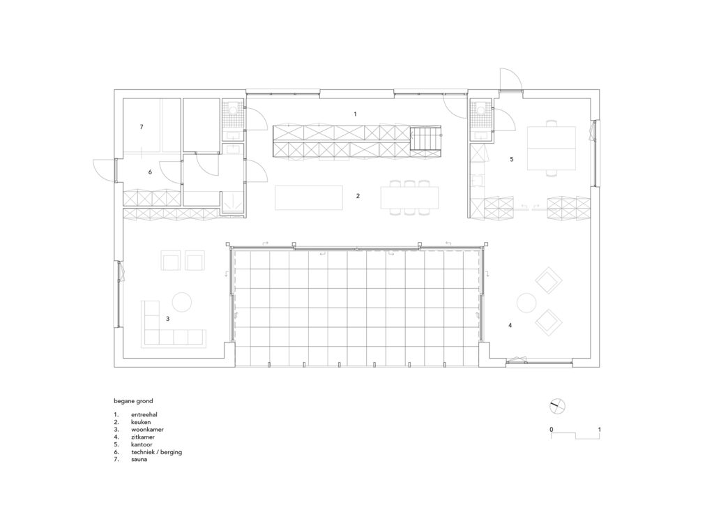 The custom built-in furniture acts as a subtle separation between the living areas and the study and bedrooms. The study is connected to the playroom through ensuite doors. In addition to kitchen appliances and a coffee corner, the kitchen furniture also houses the wardrobe, storage and a staircase to the upper floor. The bedrooms all have a walk-in closet in the hallway area, where a large skylight provides daylight.