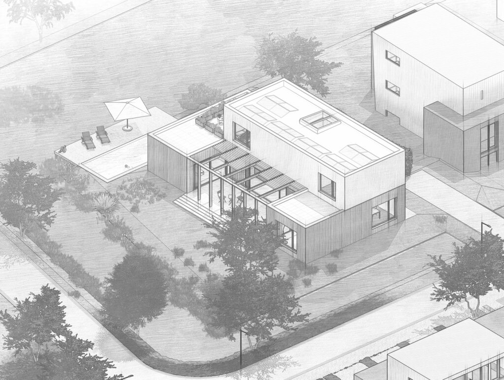 The light gray stucco upper floor rests like a monolithic volume on a tactile wooden substructure in which the facade, pergola and outdoor spaces blend together. The carefully positioned windows break through the largely closed facades and offer framed views of the surrounding landscape.