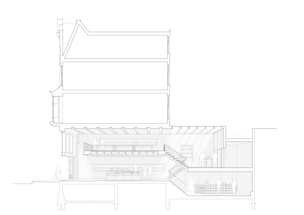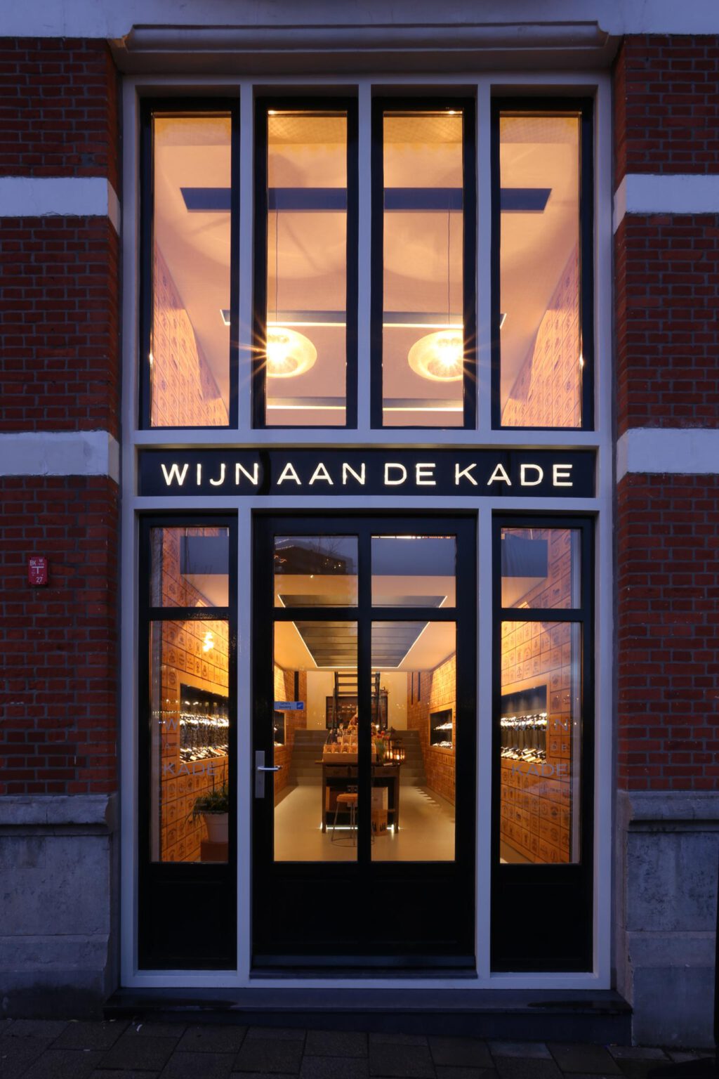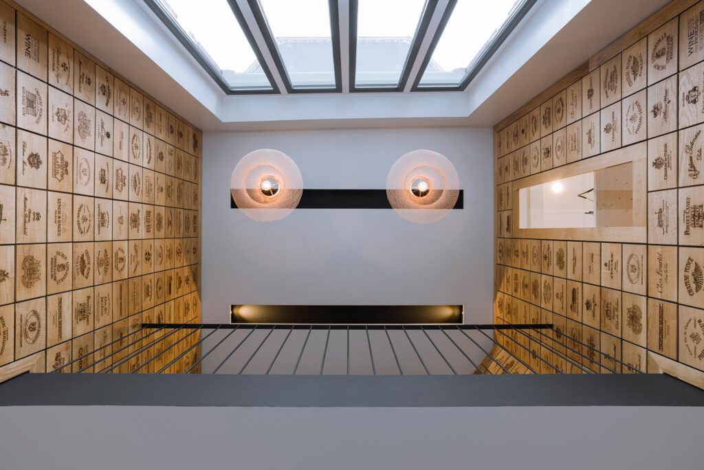 met elkaar verbonden en vormen zo één genereuze en lichte ruimte. Met een metselwerk trap kan vanuit de winkel de wijnkelder worden betreden. Deze intrigerende donkere ruimte herbergt de collectie luxe wijnen. De verdiepte ligging waarborgt een constante en koele temperatuur, ideaal voor het langdurig bewaren van wijn. Het meubilair in de winkel is op maat ontworpen. In de kelder bieden twee lange zwarte meubels ruimte voor de collectie van luxe wijnen. Op de begane grond staat een groot meubel met opslag, een geïntegreerde kassa en een ruim werkvlak. Op het entresol staat een klein barmeubel waar wijn kan worden geproefd. De bel-etage is ingericht voor grotere proeverijen en is voorzien van educatieve tafels waarin kaarten van wijngebieden zijn gegraveerd.