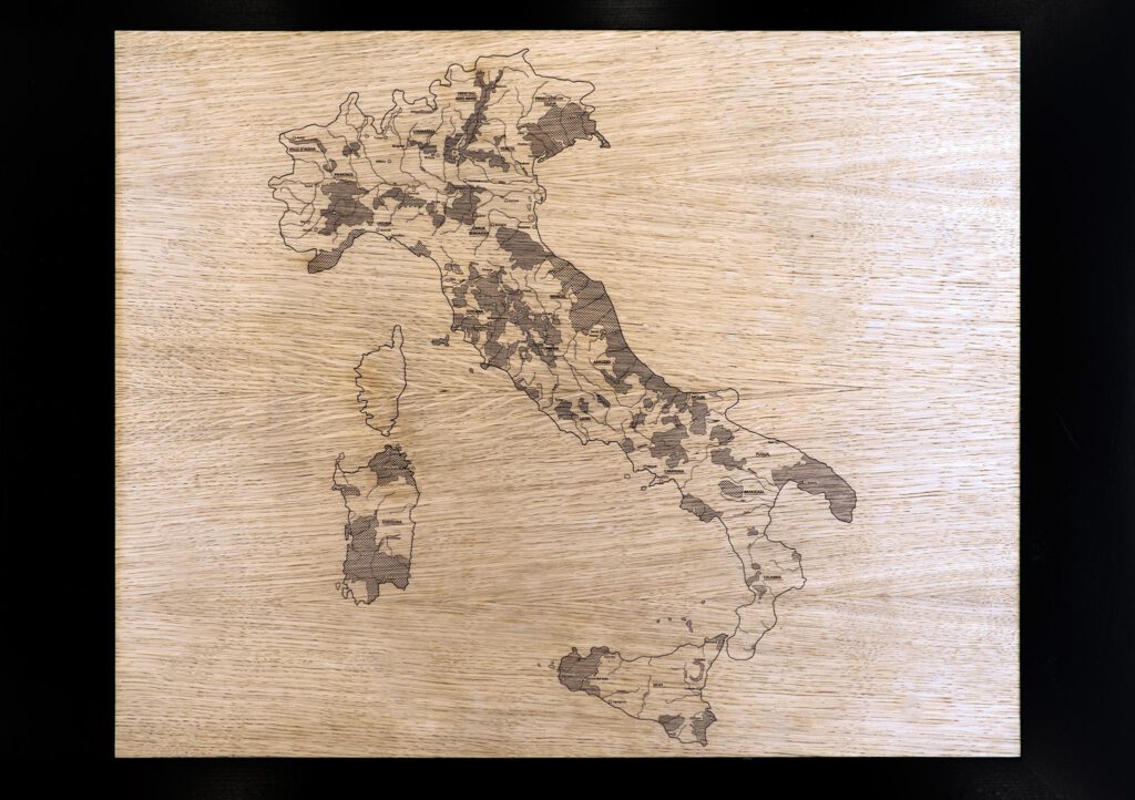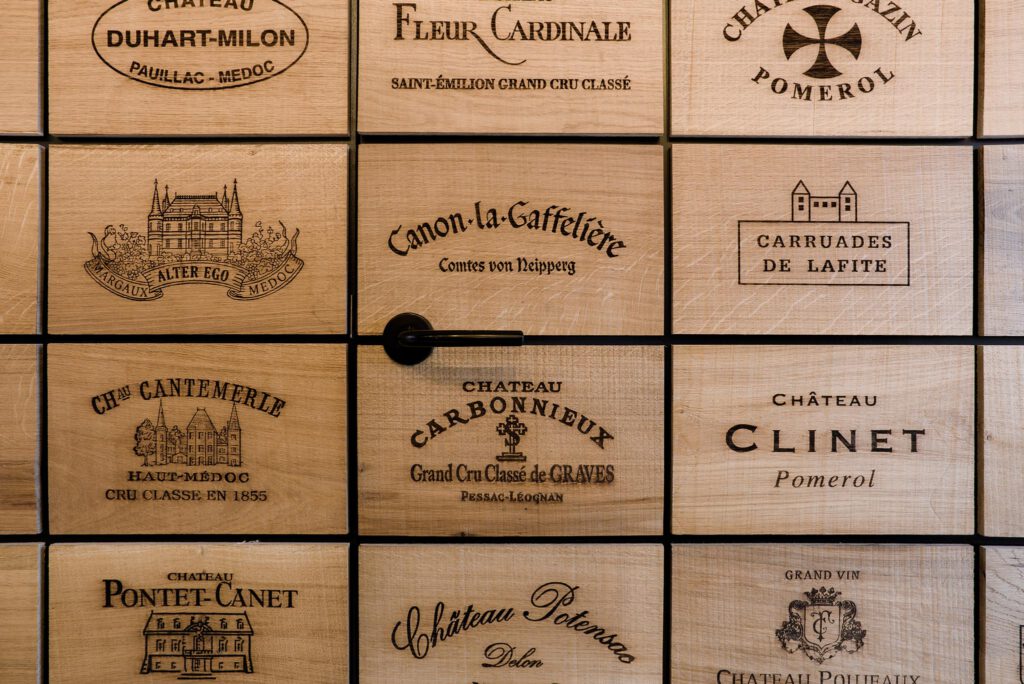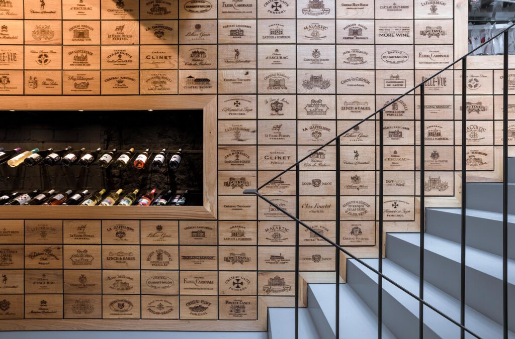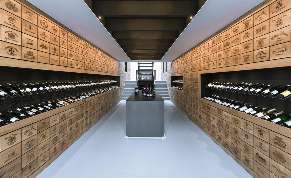 Aan weerszijden van de winkel zijn over de volledige hoogte twee op maat gemaakte kastenwanden geplaatst. Grote sparingen in de wanden vormen display ruimtes voor ruim 300 flessen wijn. Van de verschillende wijnen wordt slechts één fles gepresenteerd, de voorraad ligt in de kasten verborgen. De wijnwinkel oogt hierdoor rustig en overzichtelijk. De kastenwanden zijn bekleed met een raster van eikenhouten panelen. Deze panelen hebben het formaat van een wijnkist en zijn elk voorzien van laser gegraveerde logo’s van bekende wijnhuizen. Naast ruimte voor opslag van wijnen dienen de kasten tevens als scheiding tussen de winkel en ondersteunende ruimtes zoals een magazijn, toiletten en een kantoor.