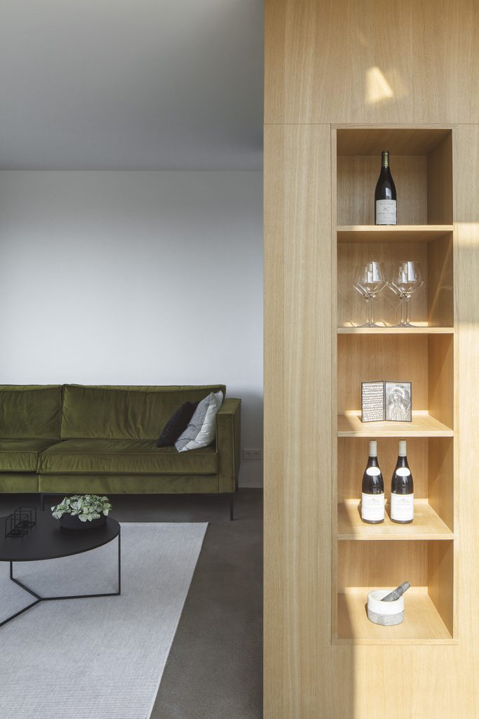 In het hart van de woning worden trappen, garderobe, toilet en open haard gecombineerd in een centraal ‘meubel’. Dit meubel wordt uitgevoerd in eikenhout en vormt zo een opvallend warm contrast met de donkere buitenzijde. Voor de materialisering van de buitenzijde is gekozen voor vezelcement leien. Door de toepassing van deze leien kan een scherpe detaillering worden toegepast waarin de overgang van gevel naar dak vrijwel naadloos wordt gerealiseerd.